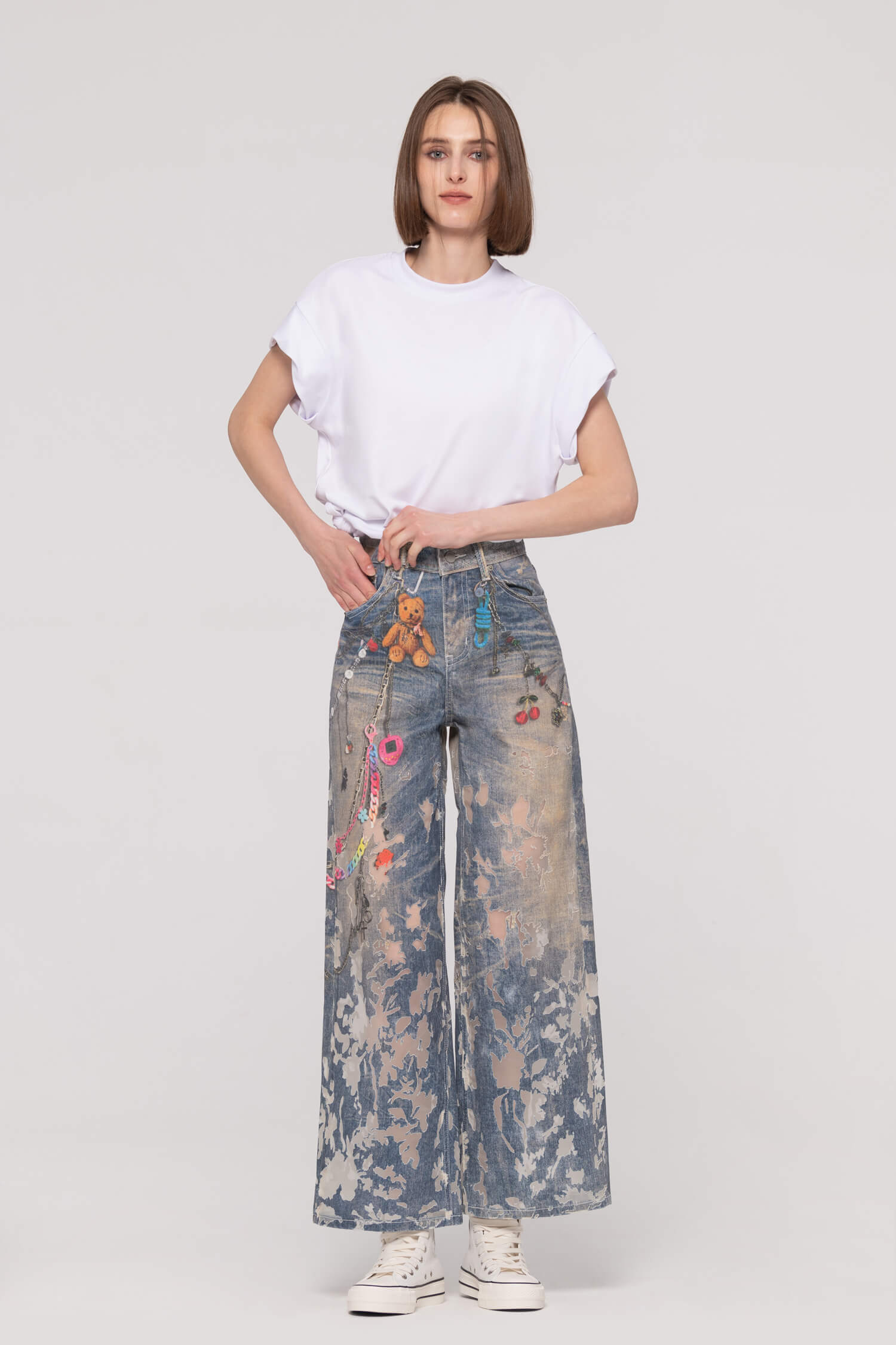 Discover the future of denim with our 3D printed burn-out wide leg jeans, uniquely blended with delicate lace. This innovative design offers artful texture and breathable comfort. Perfect for casual strolls, creative workdays, or standing out at stylish gatherings.