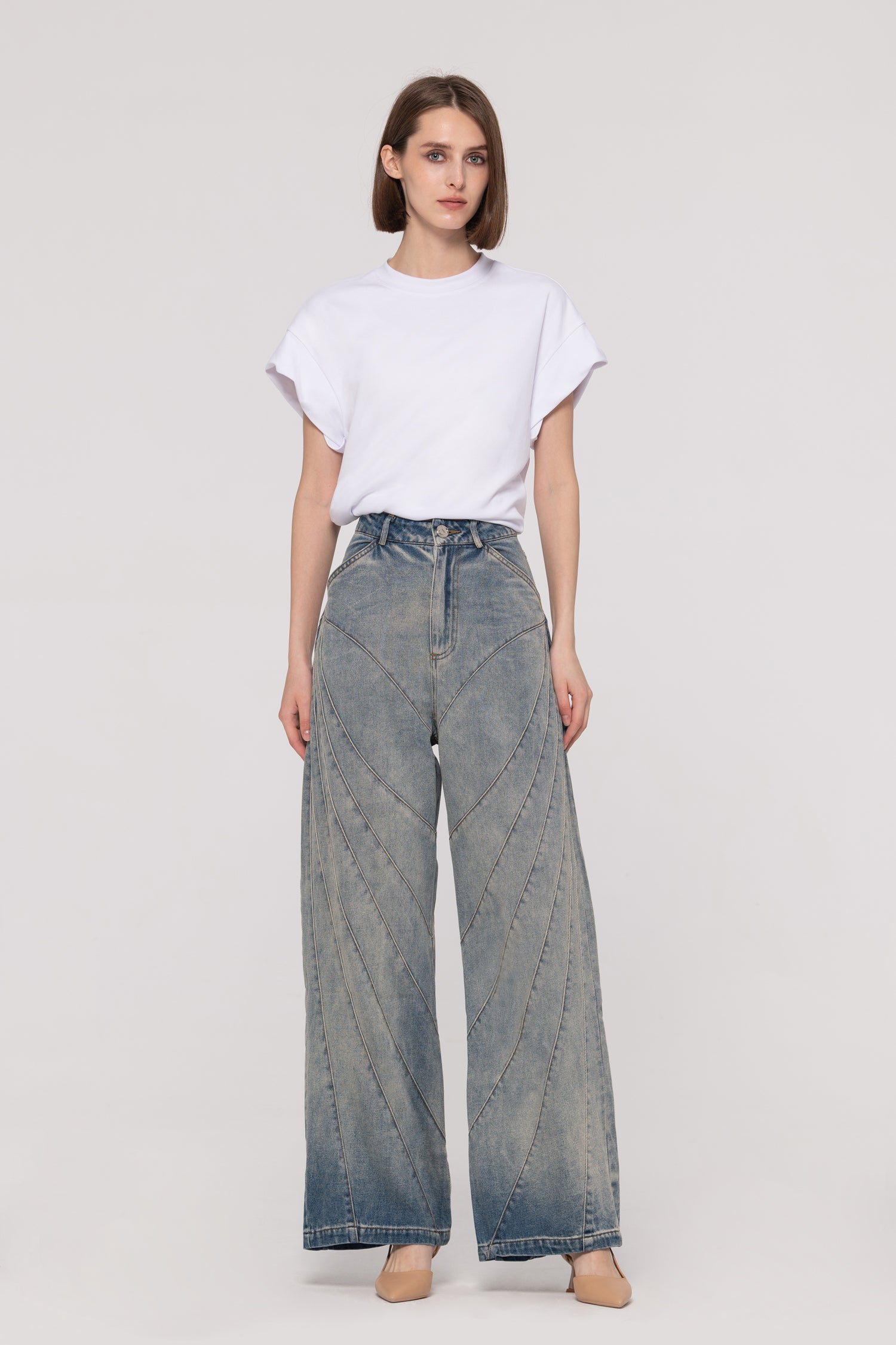 Crafted with unique cut-and-sew detailing, these wide leg jeans offer a perfect blend of comfort and style. Designed for daily ease and effortless elegance, they’re your go-to piece—from casual mornings to spontaneous evenings out.