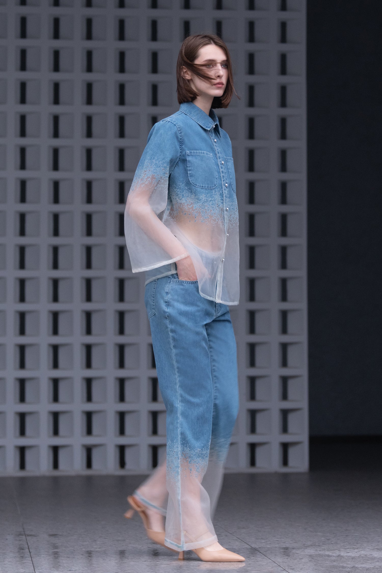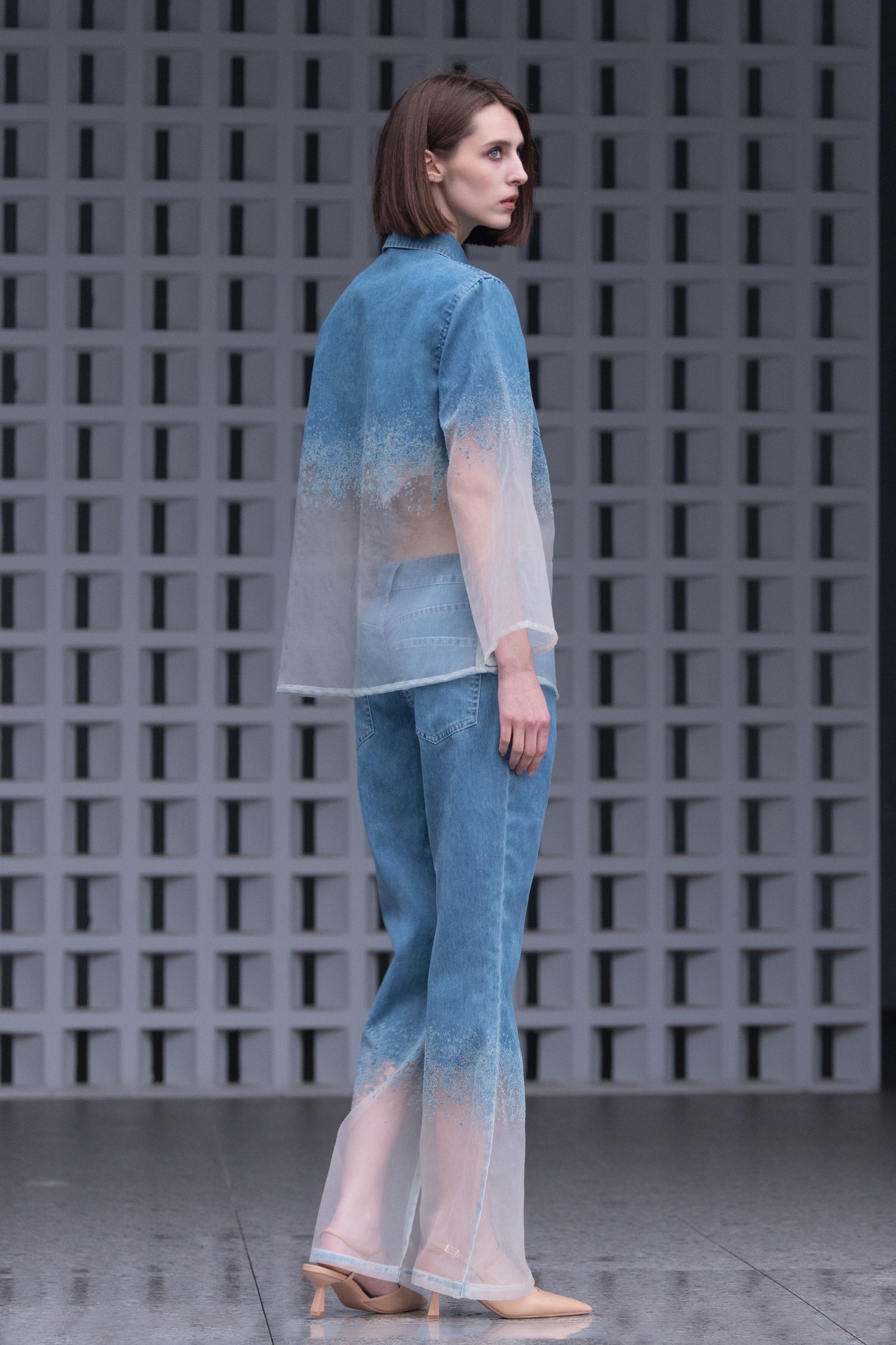 Designer Series Light Blue Burn-Out Flare Jeans: Unique burn-out reveals delicate denim-lace. Effortless style for office (blouse), street (crop top), or weekend (tee). Comfortable, standout, versatile. Experience denim artistry.